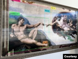 На выходе с публикой прощается огромное ИИ-полотно «Генезис: и было слово» – знаменитое «Сотворение Адама» Микеланджело дается таким, каким его воспринимает компьютерное зрение, распознающее образы. Автор работы считает, что строка из Библии «Вначале было слово» для больших языковых моделей может означать буквально то же самое, что и для религиозно мыслящей части человечества: «первая строка Библии о том, как они были созданы».