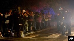 Полиция заявила, что демонстранты перекрыли улицы мусорными баками и заграждениями, а на тротуаре перед зданием ассоциации был разожжен огонь.