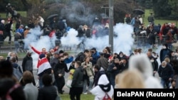 Демонстранты столкнулись с милицией, когда они двигались ко Дворцу независимости в Минске.
