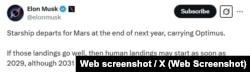 В сообщении, опубликованном в соцсети X, миллиардер предположил, что высадка людей на Марсе может произойти уже в 2029 году, назвав при этом первый пилотируемый полет в 2031 году более вероятным.