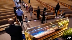 В понедельник люди в масках, чтобы не допустить распространения коронавируса, образовали процессию в церкви «Источник хвалы» в Хьюстоне, родном городе Флойда, чтобы увидеть открытый гроб, у которого они останавливались, чтобы отдать дань уважения.