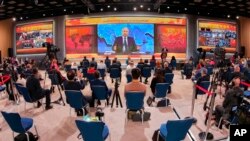 В этом году пресс-конференция прошла по видеосвязи из-за пандемии коронавируса. Глава государства находился в своей резиденции в Ново-Огареве, а журналисты и фотографы – в зале Центра международной торговли в Москве.