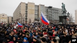 МОСКВА – Несмотря на морозную погоду, несколько тысяч человек в воскресенье вышли на улицы городов России, чтобы выразить протест против отсутствия конкуренции накануне мартовских президентских выборов, из-за чего, как они считают, сохранение власти Владимиром Путиным до 2024 года практически гарантировано.