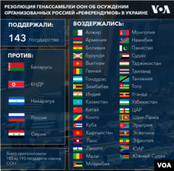 143 страны – три четверти Генассамблеи ООН, состоящей из 193 членов – поддержали резолюцию, в которой также подтверждаются суверенитет, независимость, единство и территориальная целостность Украины в пределах ее международно признанных границ.