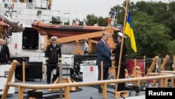 КИЕВ – Жестом поддержки, который усиливает оборонное сотрудничество между Вашингтоном и Киевом, назвал президент Украины Петр Порошенко передачу Военно-морским силам Украины двух патрульных катеров береговой охраны класса Island.